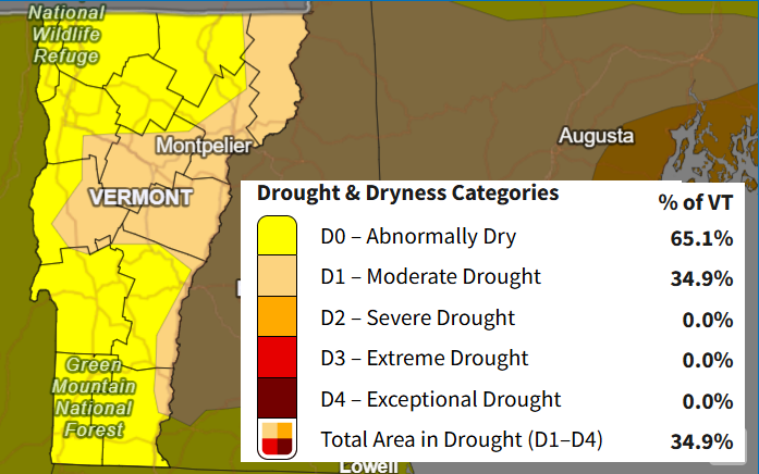 All of Vermont is abnormally dry, and a third of the state is experiencing moderate drought. For drinking water systems, drought can impact both the quantity and quality of water supplies. For wastewater systems, drought may limit effluent discharges if receiving waters have low flows.