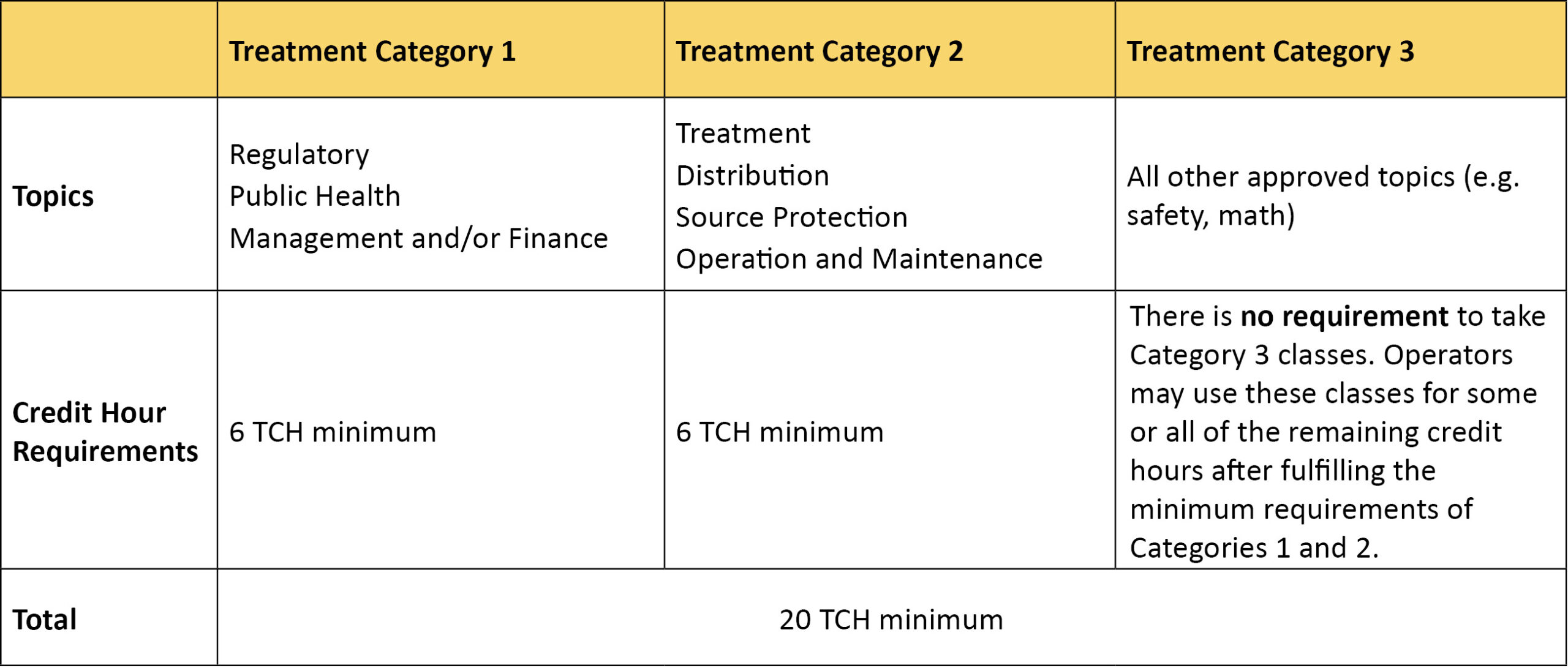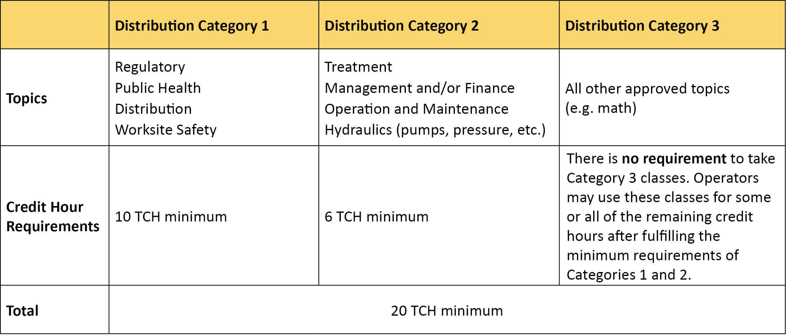 Operators who are dually certified in Class 3 Water Treatment and Distribution may use up to 10 TCHs as “dual” credit hours and apply them to both the Class 3 and Distribution renewals. This means a total of 30 TCHs are needed for renewal. Category 3 credit hours cannot be used for dual credit.