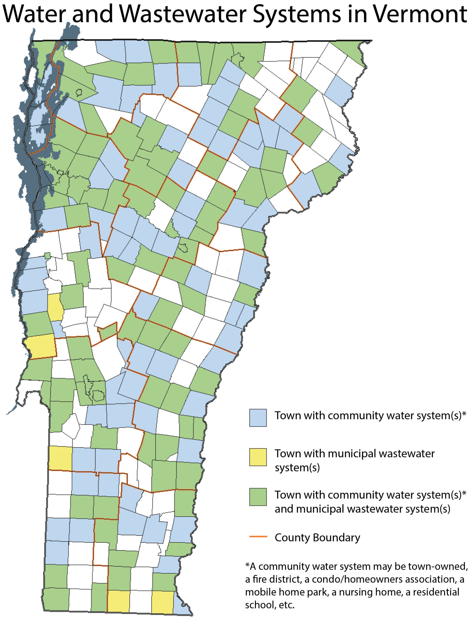 Less than one quarter of all community water systems in Vermont are owned by a town, village, or city. Over three-quarters are owned and governed outside of a traditional town municipal structure. “Public drinking water system” DOES NOT always mean publicly owned.